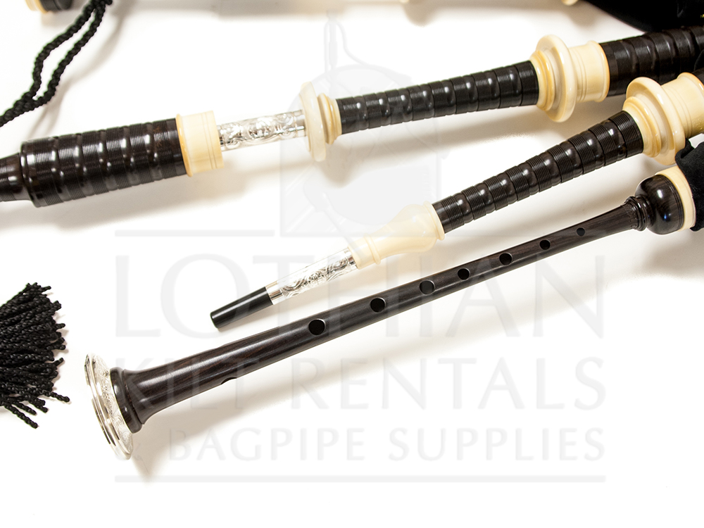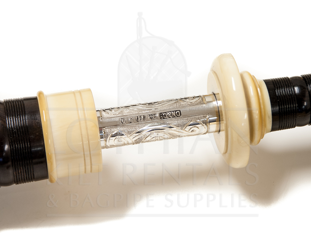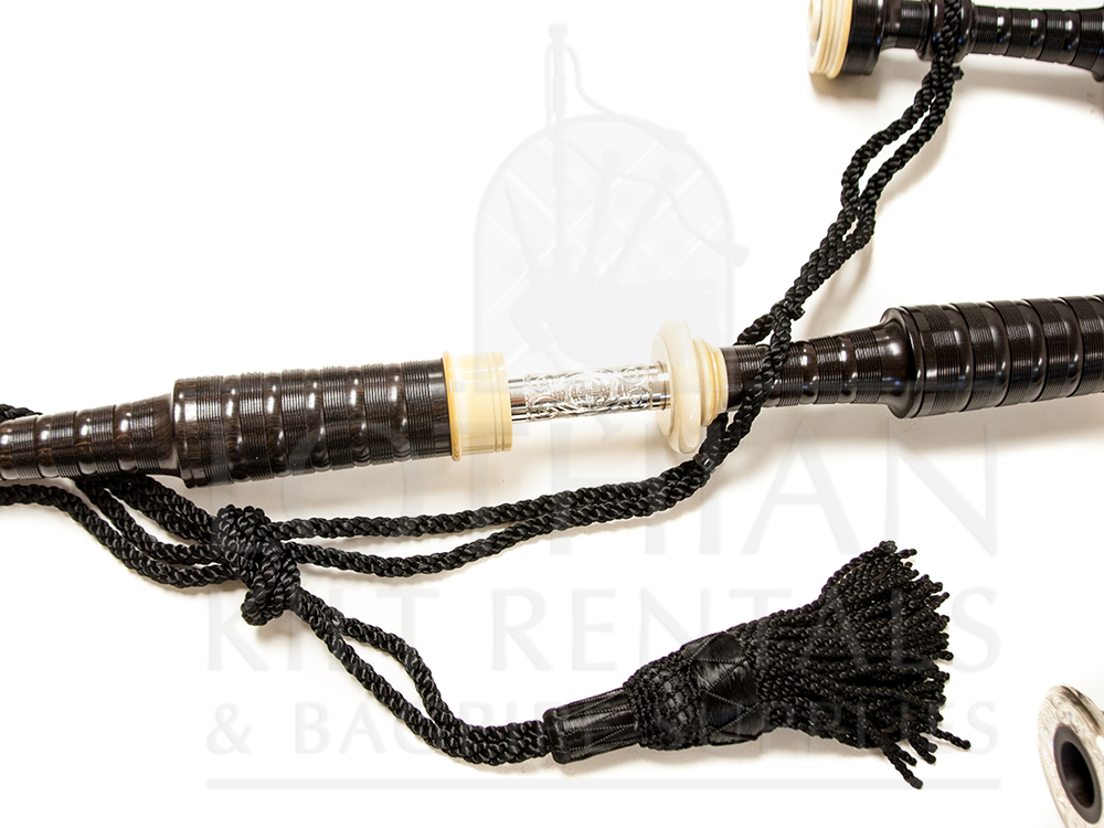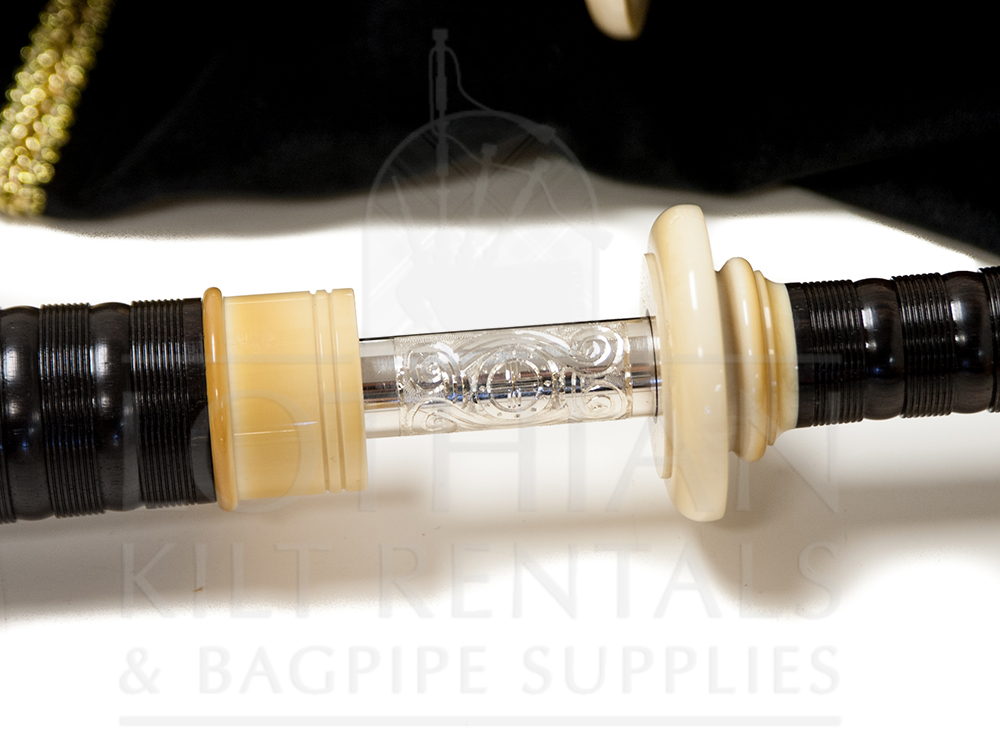 This set is pictured with a Naill blackwood chanter with a sterling silver sole to match the pipes. This option is available as an upgrade.